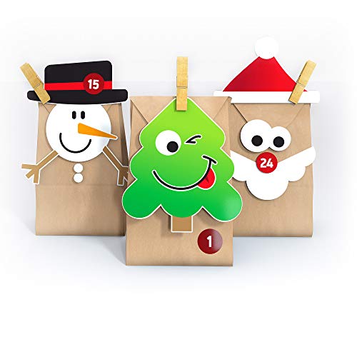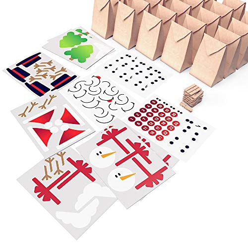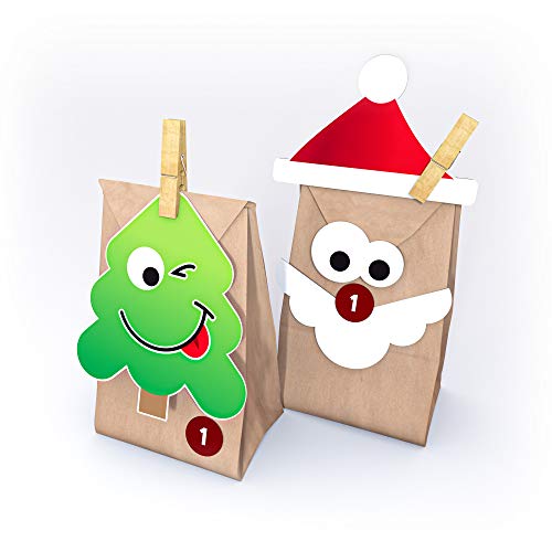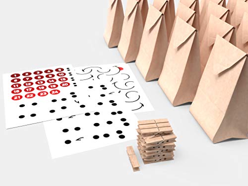 Een complete set: de set bevat 26 bruine zakjes van kraftpapier, 26 houten klemmen, voorgestanste motiefkartonnen knutselvellen, adventkalendergetallen van 1-24 als stickers, en stickers met verschillende motieven. Het enige hulpmiddel dat je nodig hebt is een lijmstift