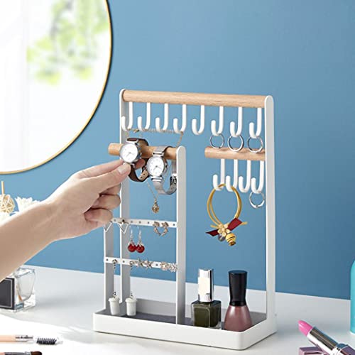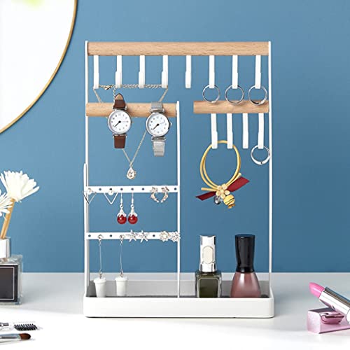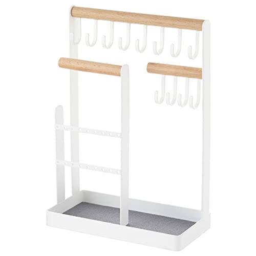 4-traps (haken, houten standaard, horizontale metalen horizontale stang met gaten en houtheidspleet). Ontwerp snelle toegang tot je artikelen. Je kunt de ketting ophangen. De houten standaard kan haarband, armband en horloge vasthouden. Horizontale stang van metaal met gaten voor oorbellen. Het houten dienblad kan ringen en glazen bevatten.