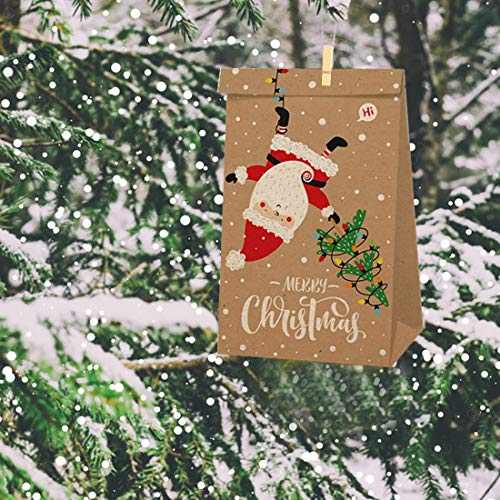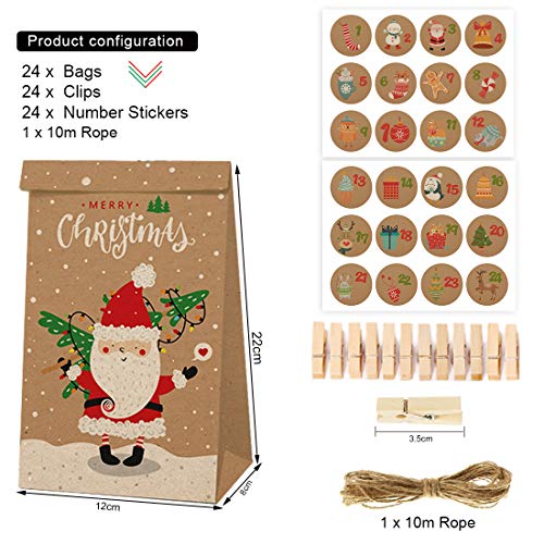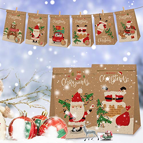 🎄🎁 Kerstkalender om te vullen: 24 kerstzakken van hoogwaardig papier, afmetingen 17 x 26 cm, 24 houten knijpers, en 24 zorgvuldig vormgegeven adventskalenderstickers voor de adventskalender om zelf te knutselen.