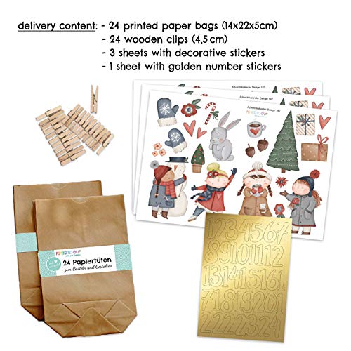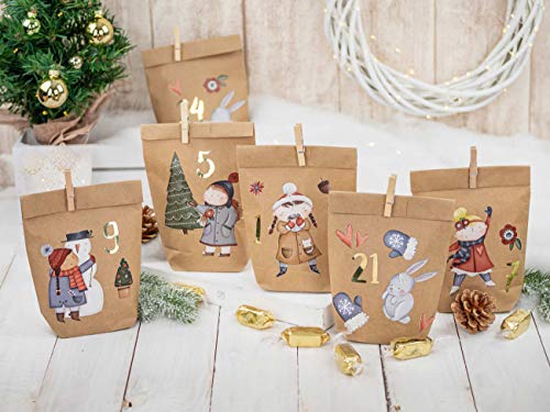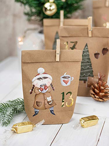 HERGEBRUIKBAAR: Met de bijgeleverde houten clips kunt u de zakjes steeds weer opnieuw sluiten en ze dus meerdere jaren gebruiken. In een rij op een plank of opgehangen aan een touwtje is deze individueel ontworpen adventskalender een echte blikvanger in de aanloop naar Kerstmis en ideaal voor kinderen.