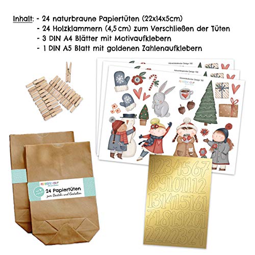 Papierdrachen DIY adventskalender om te vullen – ijsschaatser om te plakken – met 24 bruine papieren zakken en leuke stickers voor kinderen – Kerstmis