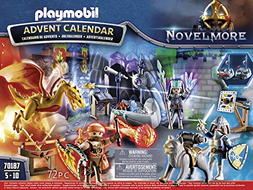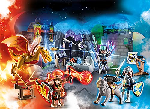 Gedetailleerd vormgegeven adventskalender met 3 ridders, 1 draak, ballist, burg-diorama van karton, en nog veel meer, aangevuld met de Playmobil Novelmore-themawereld