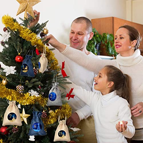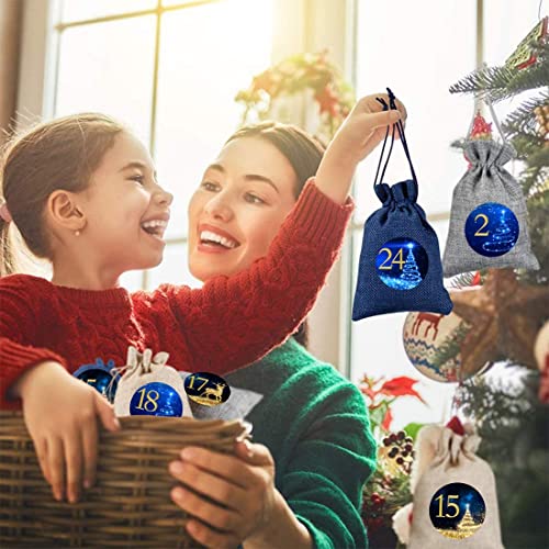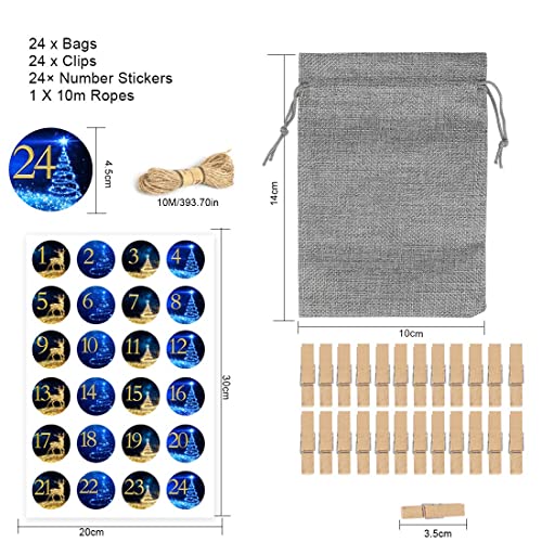 KERSTKALENDER VULLEN: Het pakket bevat 24 kleurrijke stoffen zakken (8 blauw, 8 natuurlijke kleuren, 8 grijs), 24 stickers met nummers (1-24 december), 24 houten clips, 10m henneptouw.